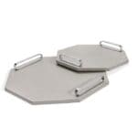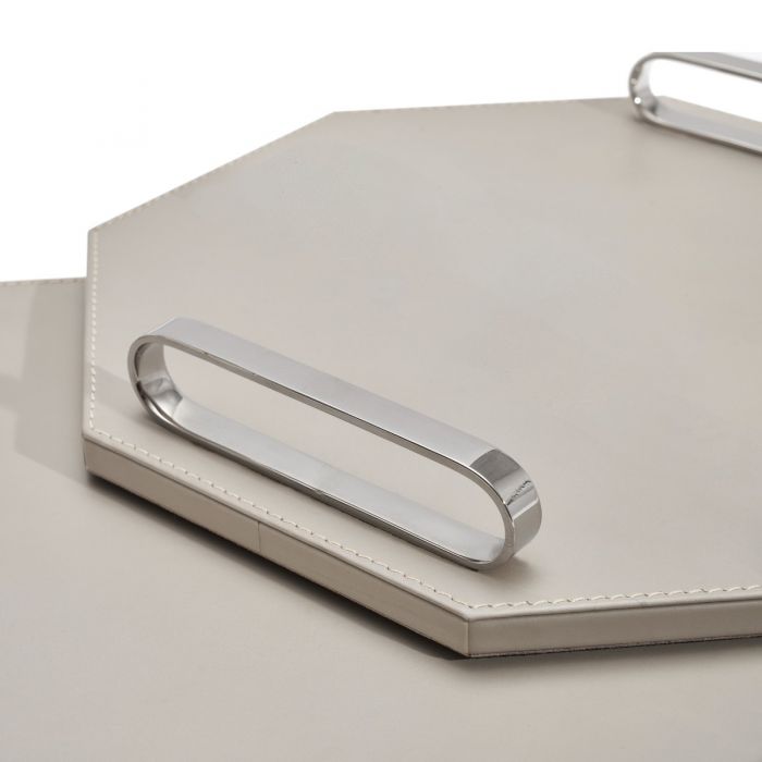 The marriage of light grey leather and metal handles in a polished nickel finish turn an entertainment essential into the chicest of accents in the form of the Audrina Octagonal Trays.