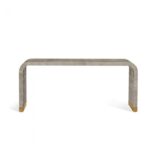 Undeniably high style, the Sutherland Console Table features the luxe texture of sorrel grey faux shagreen highlighted by brushed brass trim.