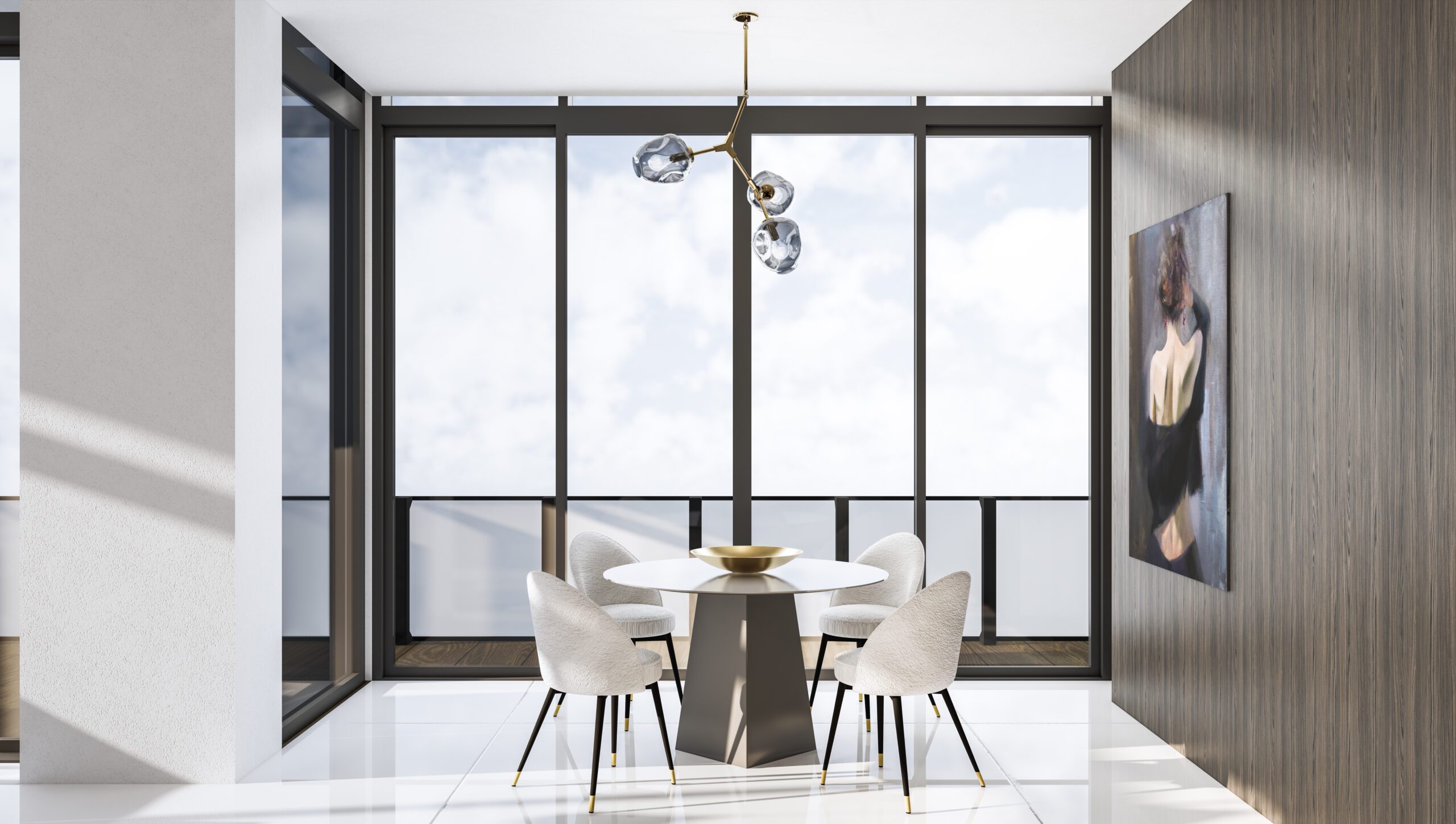 The Sofa is bedecked with the full length Wine unit on one side and a spacious dining on the other. The Wine-Unit immaculately fits into the interior, camouflaged into whole design but also acting as a separate unique element with salient feature like the large glass display wine racks and open storage enhanced with warm strip lighting highlighting the beautiful wooden texture. The dining employs a eccentric table with discernible texture with a snug and cozy chair accentuated with a dark metal lighting fixture, which ties in the whole dining space.