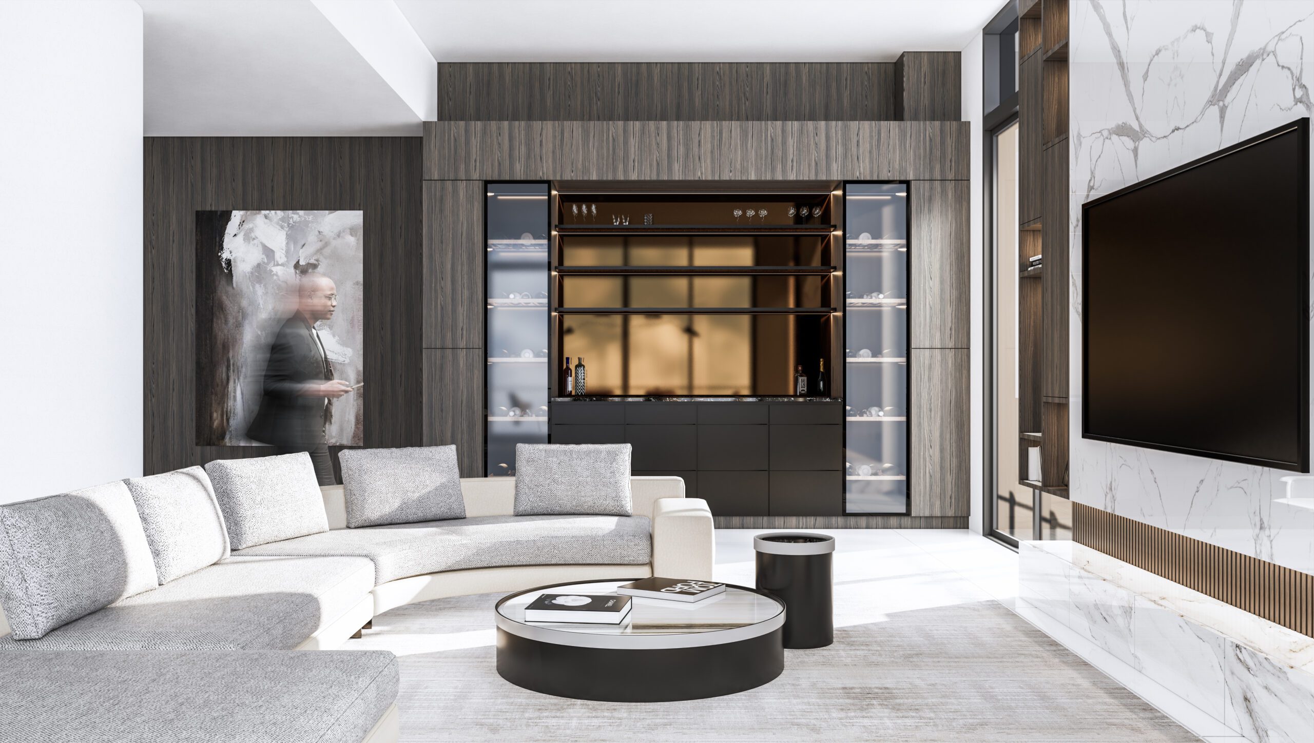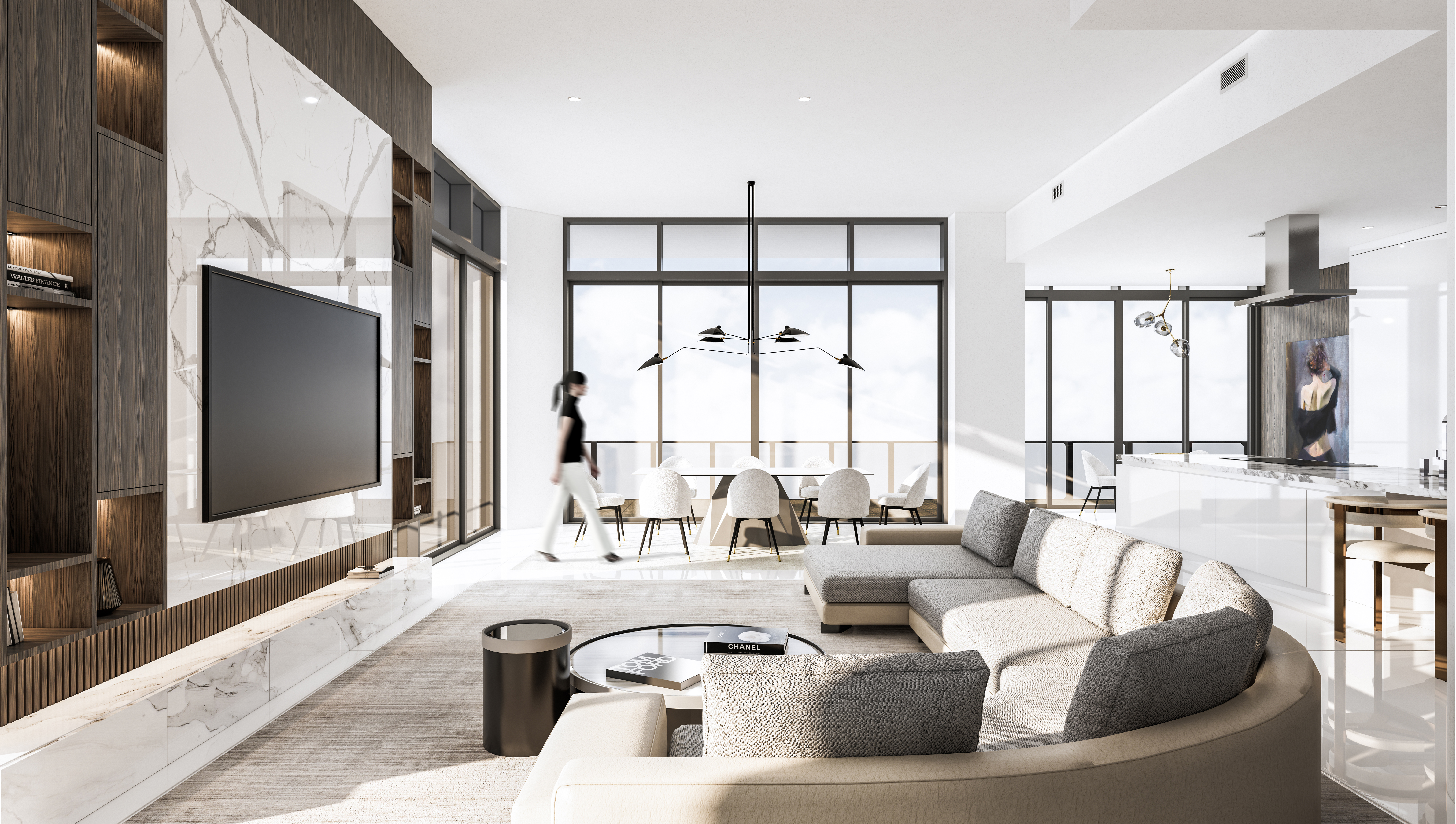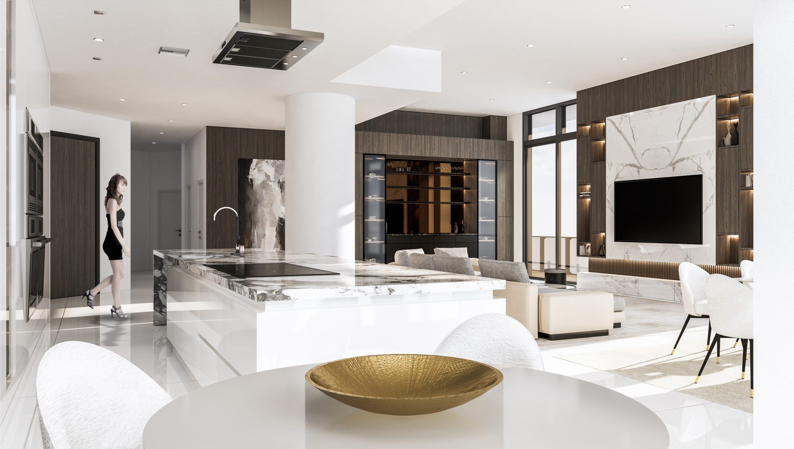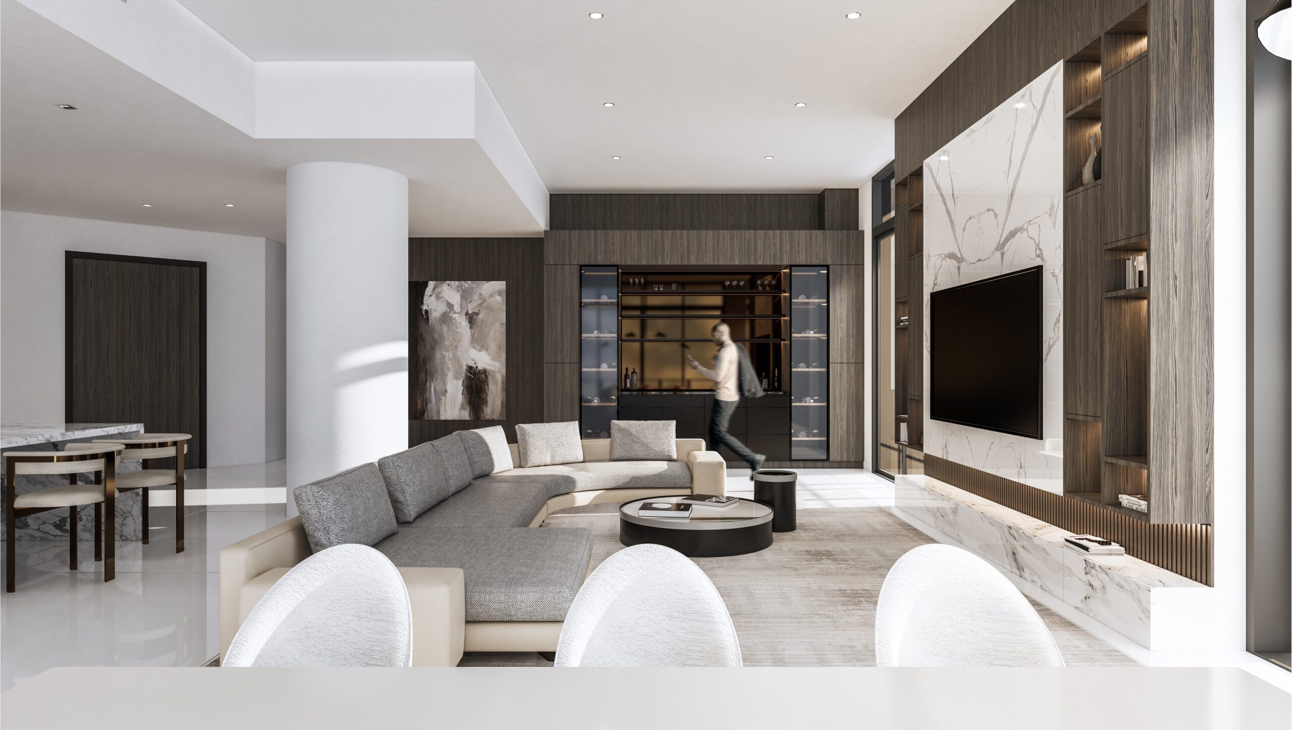 The clients wanted their highrise apartment to present a lush interior with lavish extravagant style exhibited by the furniture and materials. Keeping in line with the brief, a curvilinear comfortable sofa was brought into the space centered to the whole open living/ dining & kitchen space. An earthy color palette was implemented by incorporating beige, grey, and white fabrics, with heavy texture wooden laminates and white clear marble flooring. A large TV unit, aligned with the sofa, was designed with symmetrical open storage on either side and a large white book matching the marble used in the center which acts a focal point for the whole space.