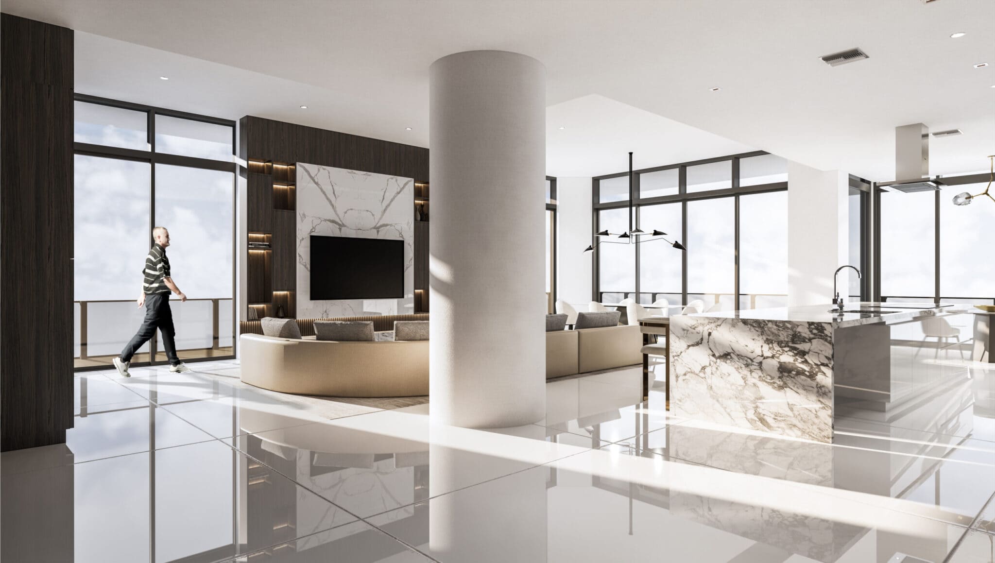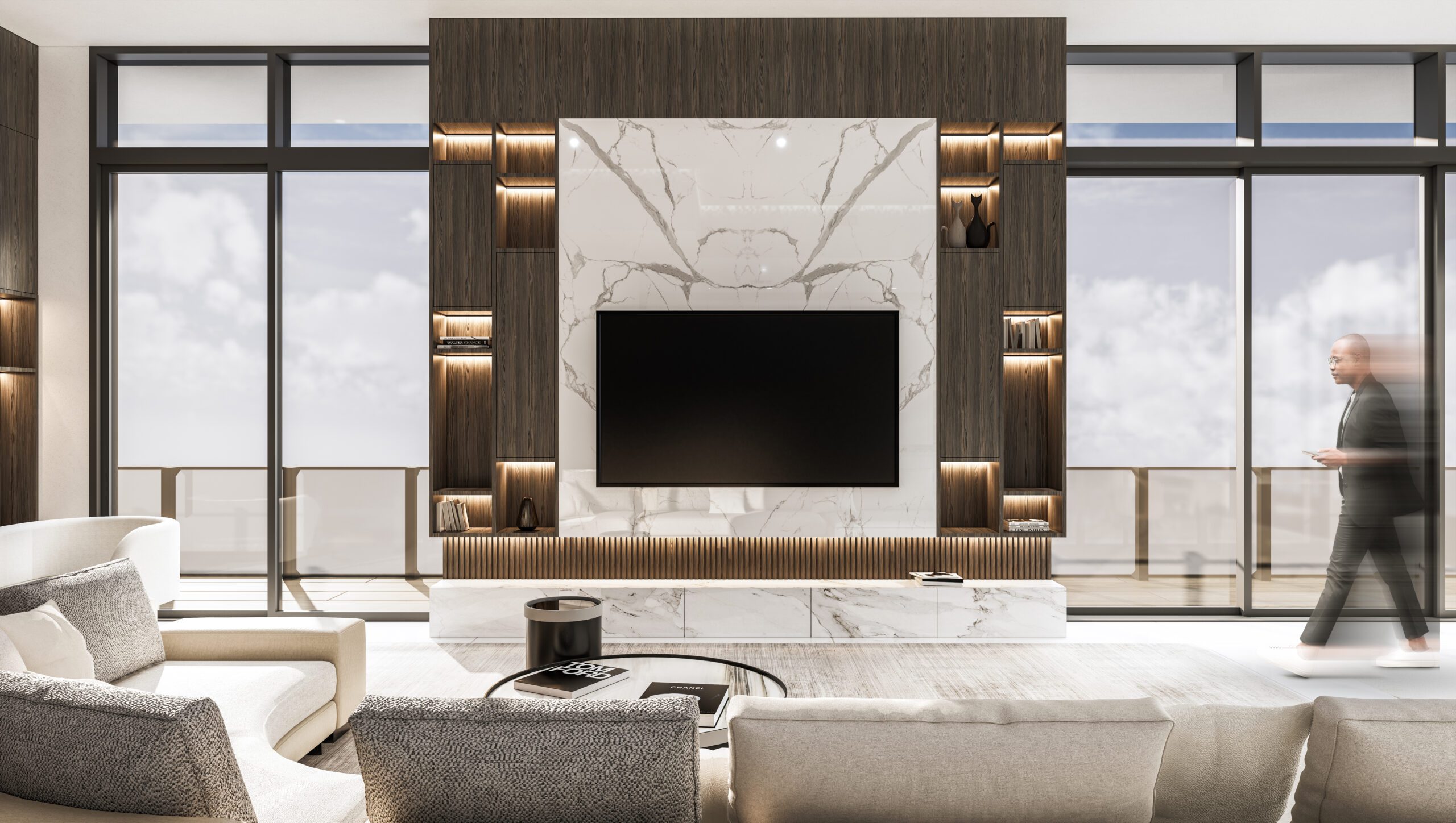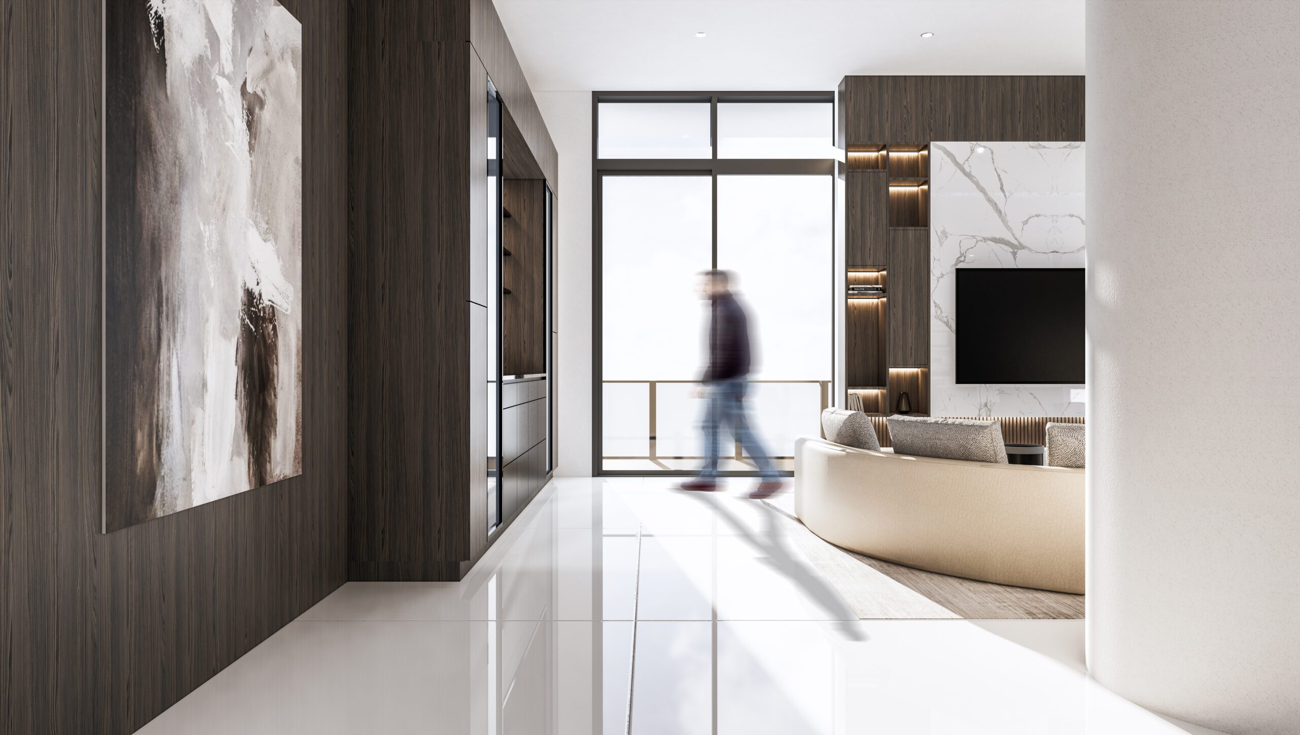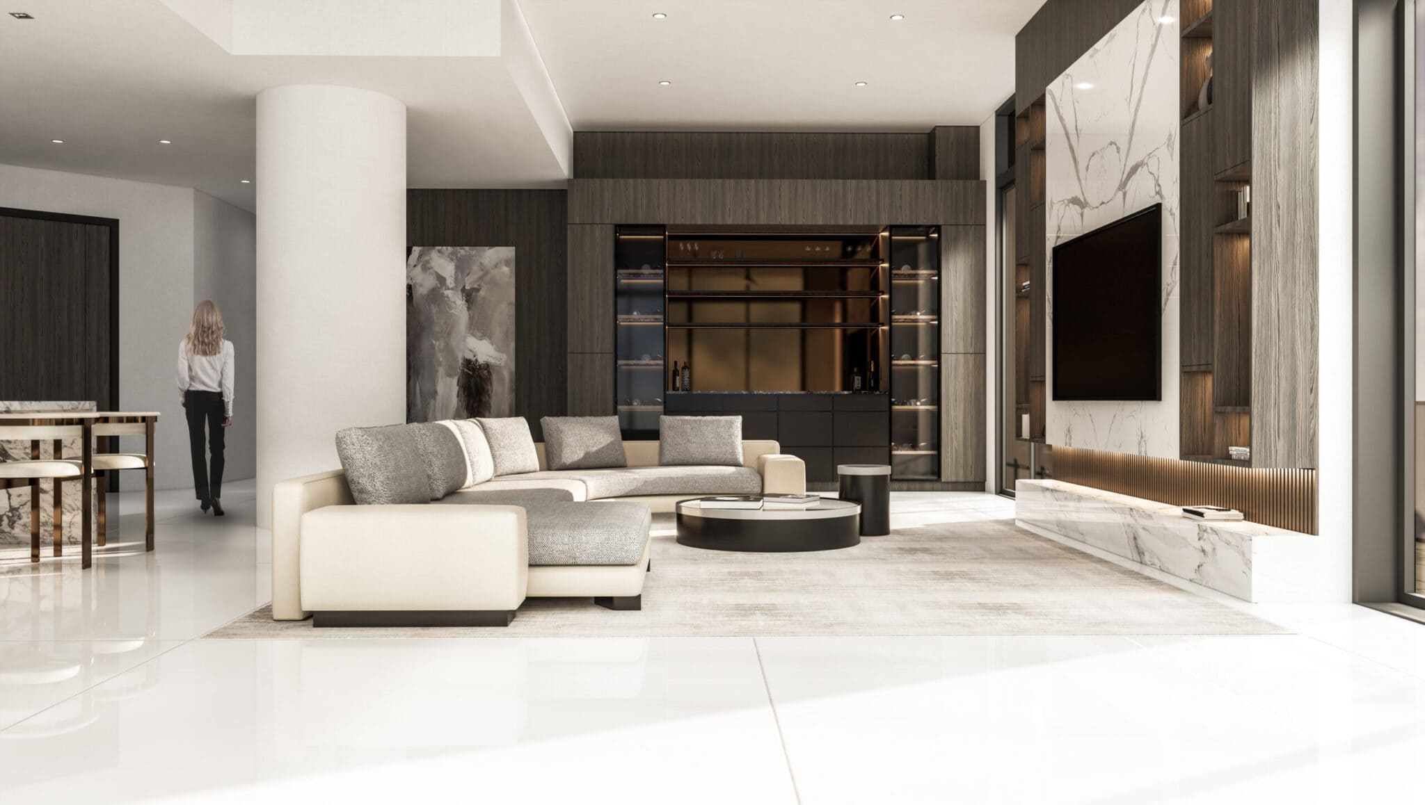 The clients wanted their highrise apartment to present a lush interior with lavish extravagant style exhibited by the furniture and materials. Keeping in line with the brief, a curvilinear comfortable sofa was brought into the space centered to the whole open living/ dining & kitchen space. An earthy color palette was implemented by incorporating beige, grey, and white fabrics, with heavy texture wooden laminates and white clear marble flooring. A large TV unit, aligned with the sofa, was designed with symmetrical open storage on either side and a large white book matching the marble used in the center which acts a focal point for the whole space.