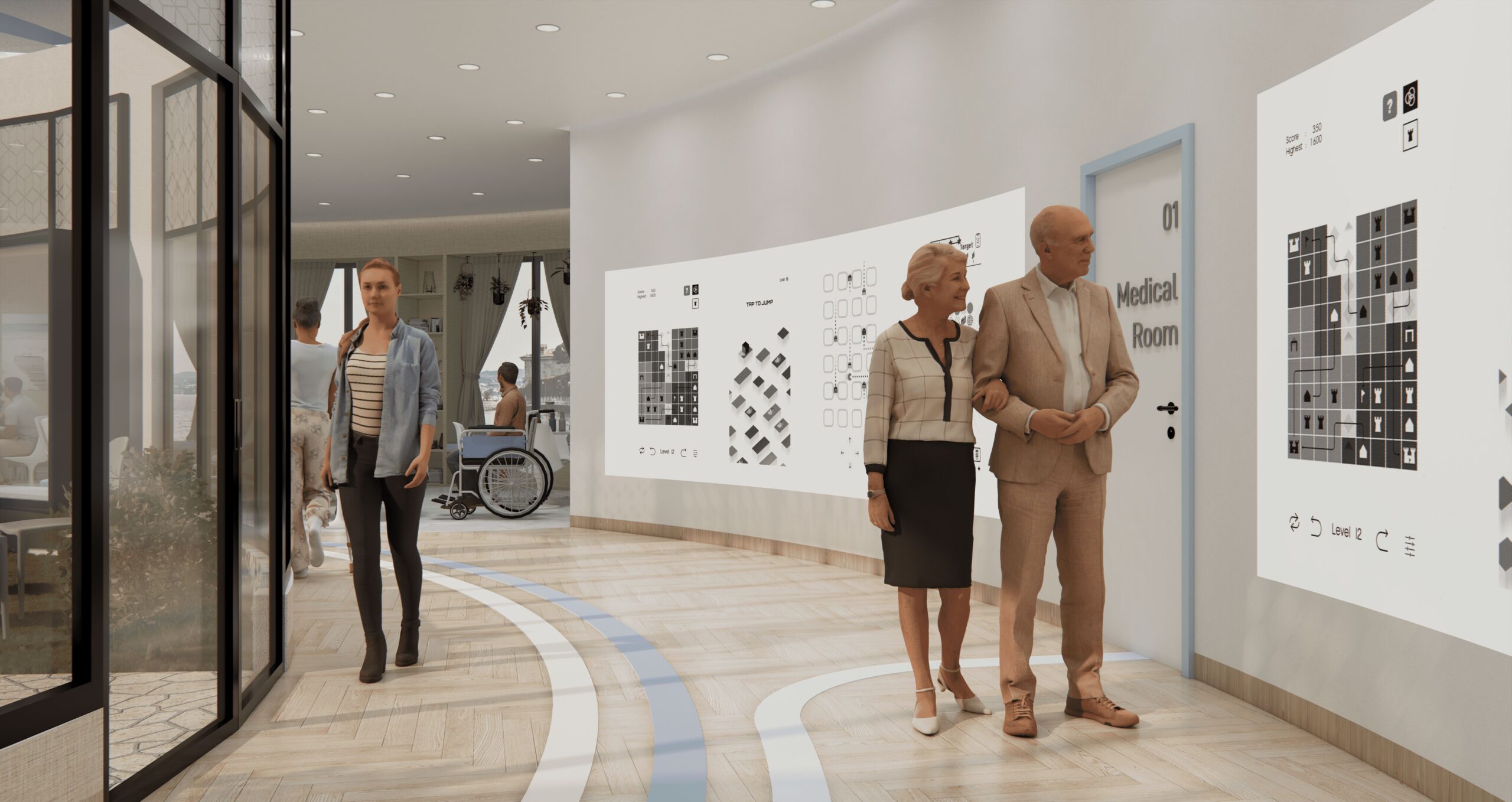 The flooring is strategically incorporated with clearly defined vibrant strips which will serve as a wayfinder and help the user better navigate the space.