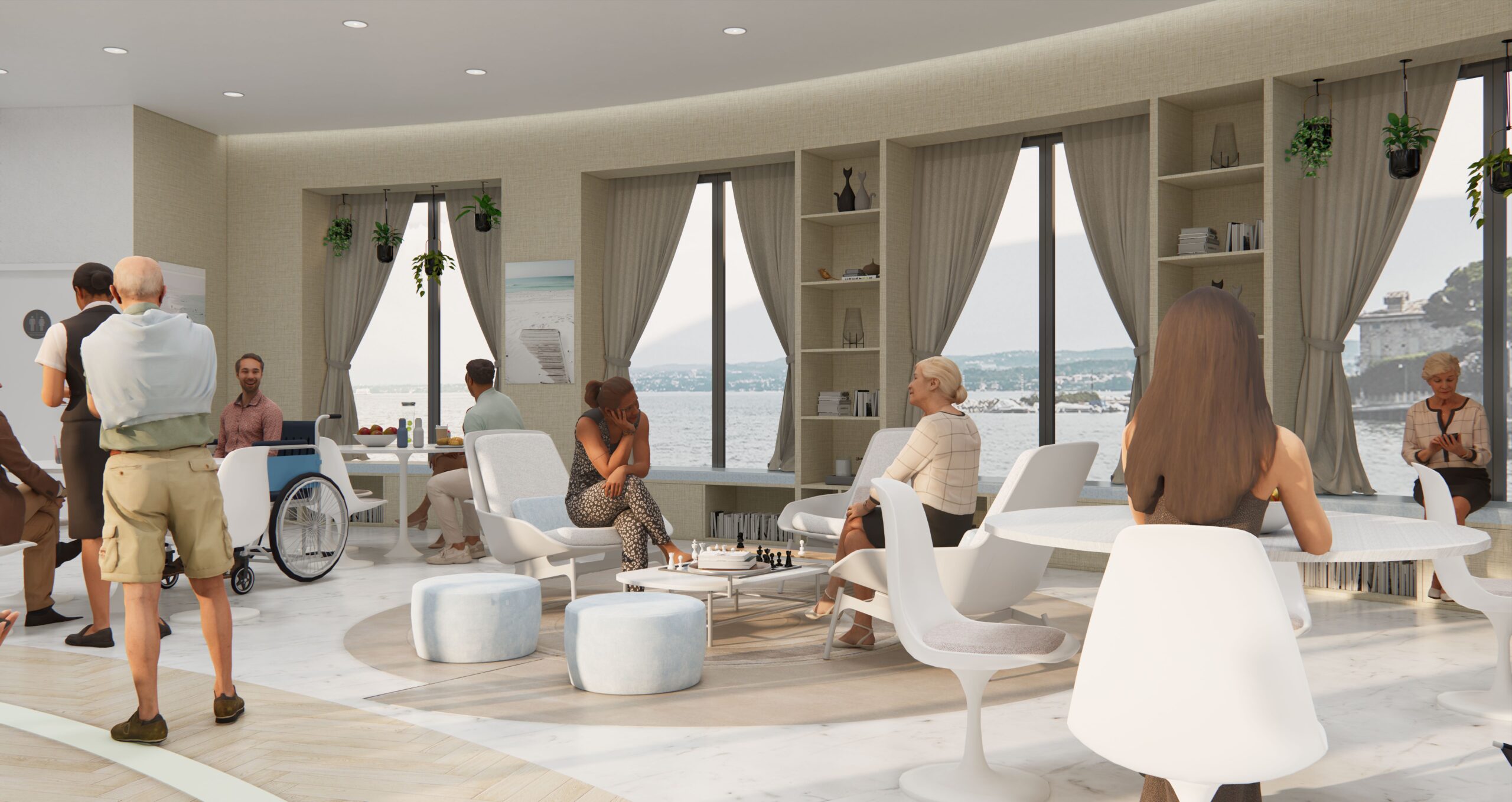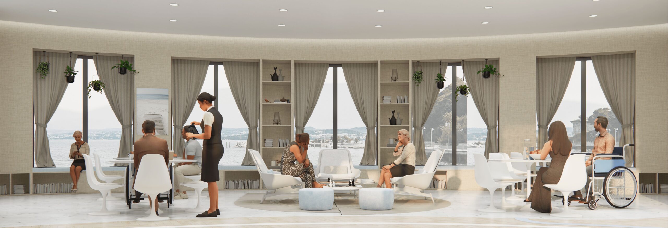 The open breakout space is designed with inbuilt seating along the wall and windows overlooking the ocean and filled with comfortable group seating layouts around the space for various activities.