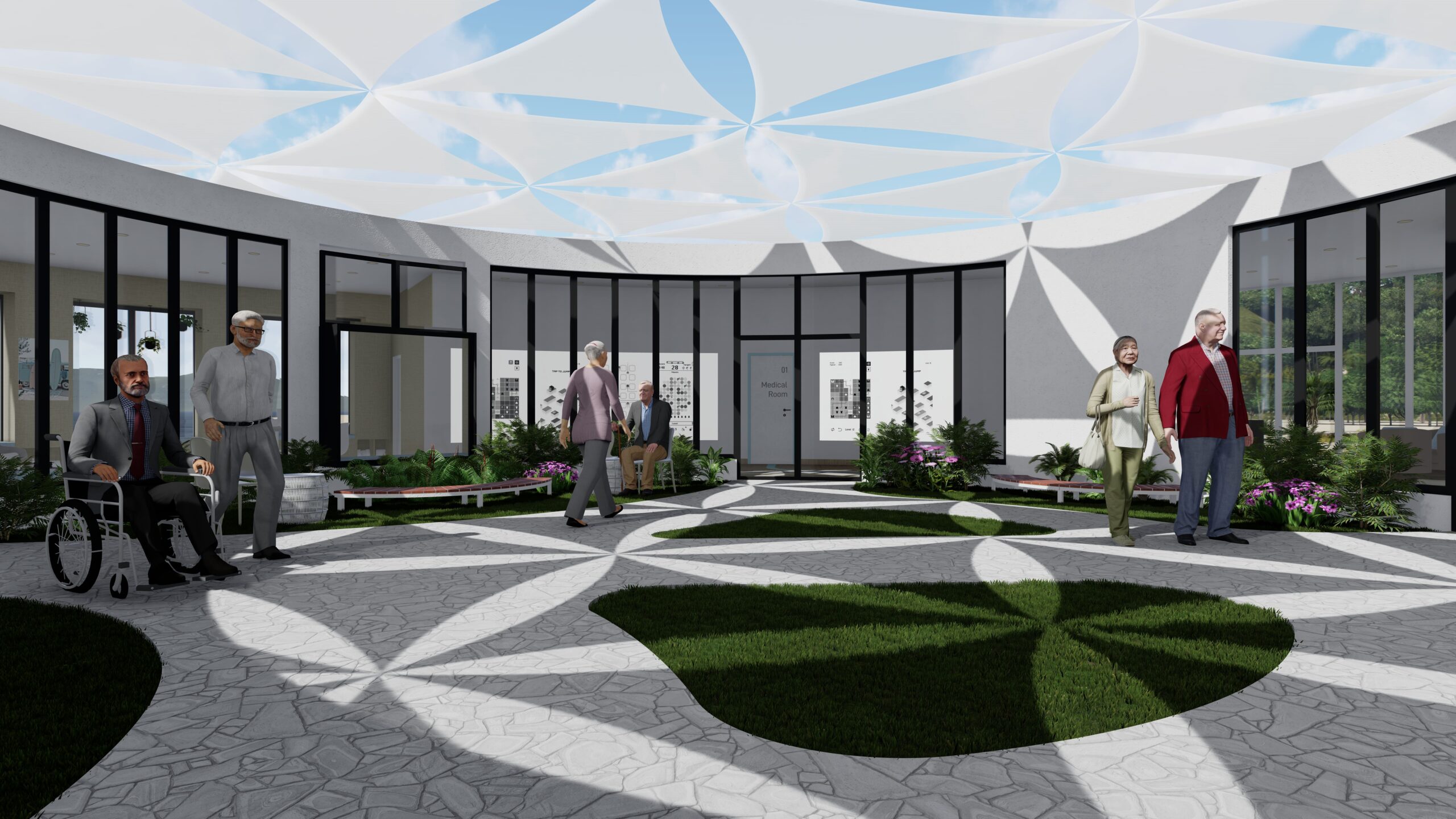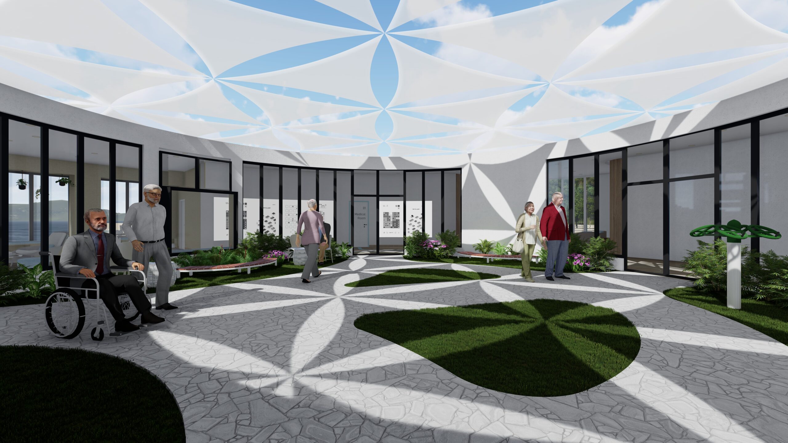 The central green core has an organic pathway with green pockets inbetween which are filled with lush greenery, benches and light exercise equipment. The green core is sheltered with a tactile fabric roof which is designed in tessellation patterns.