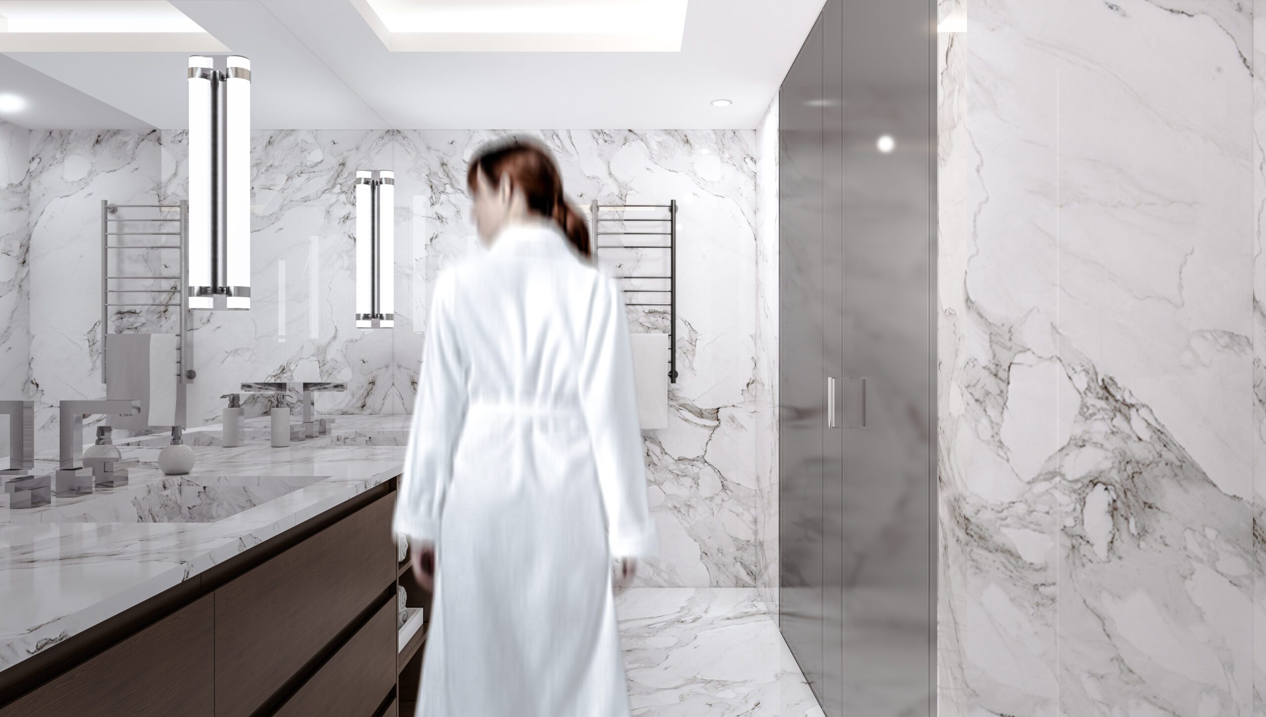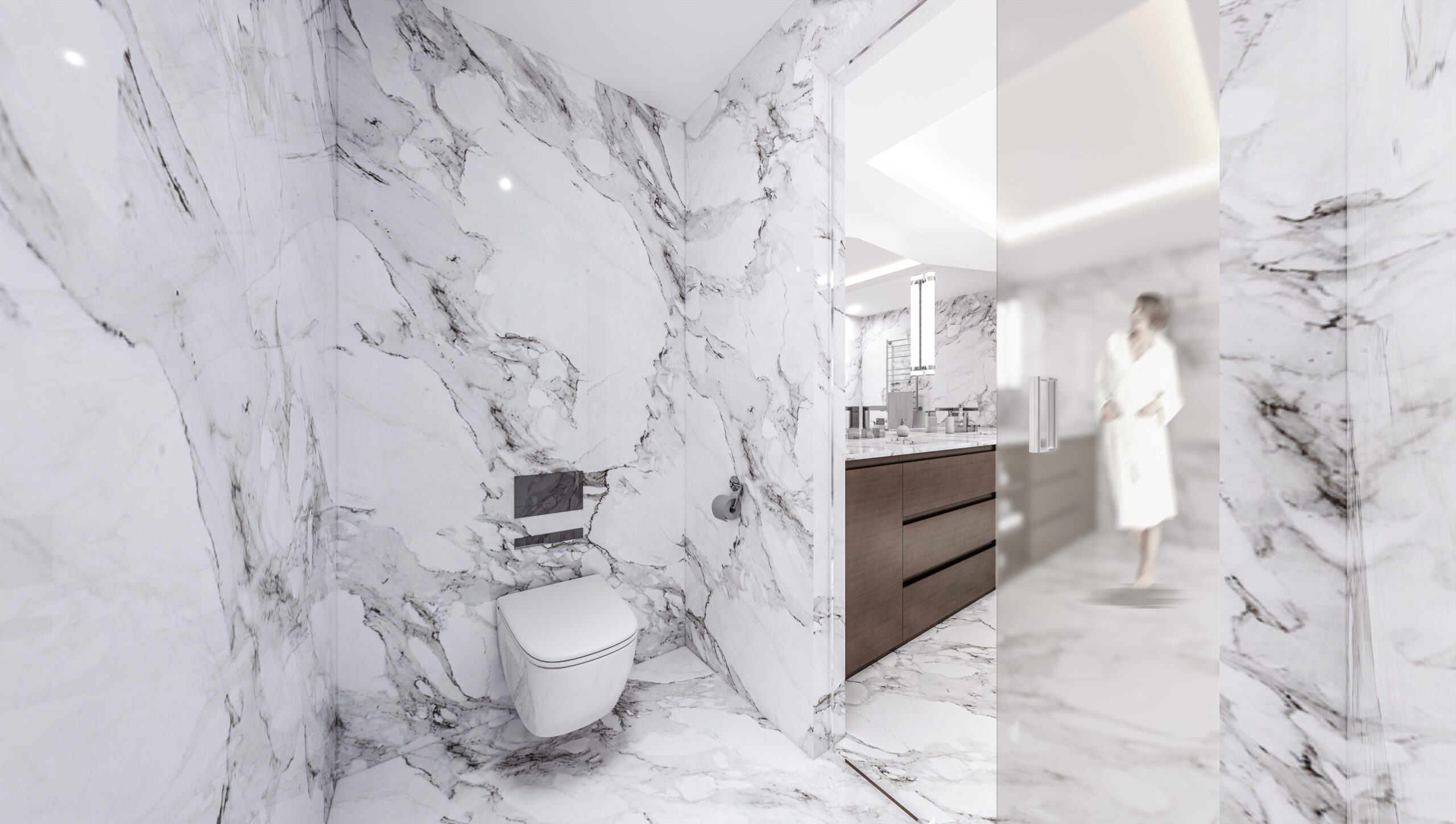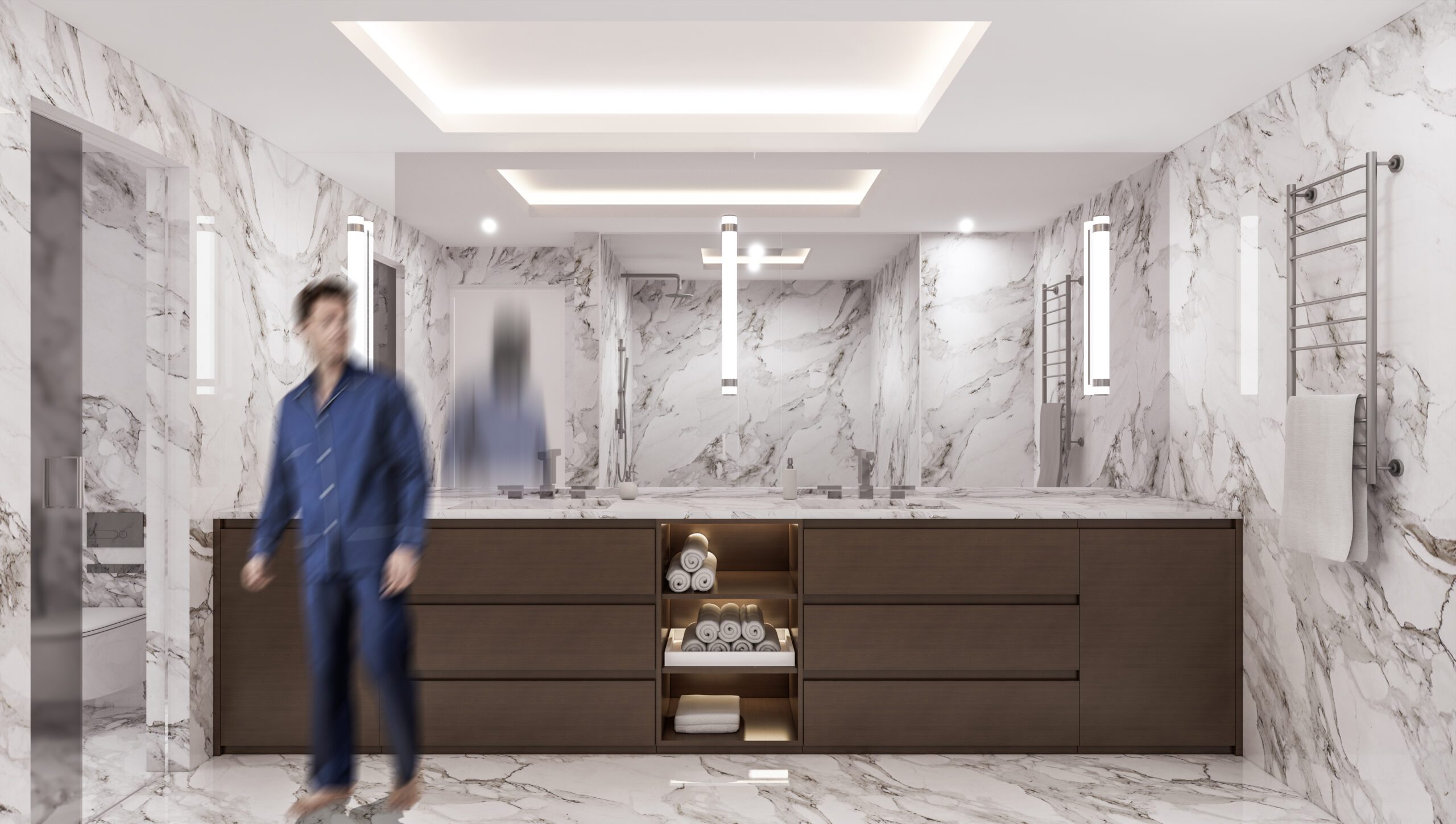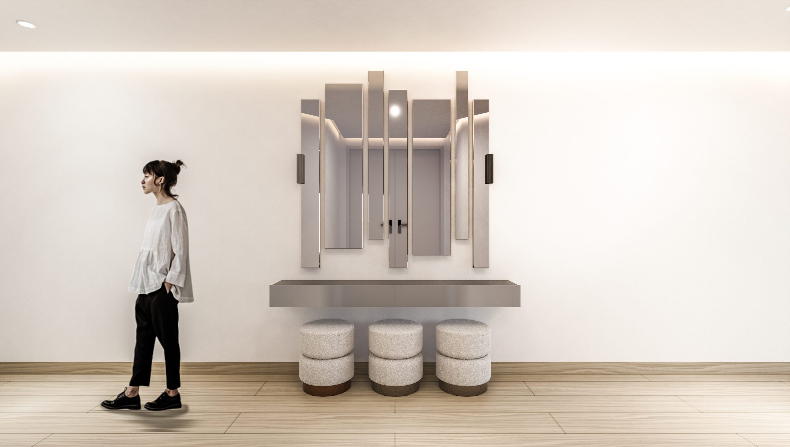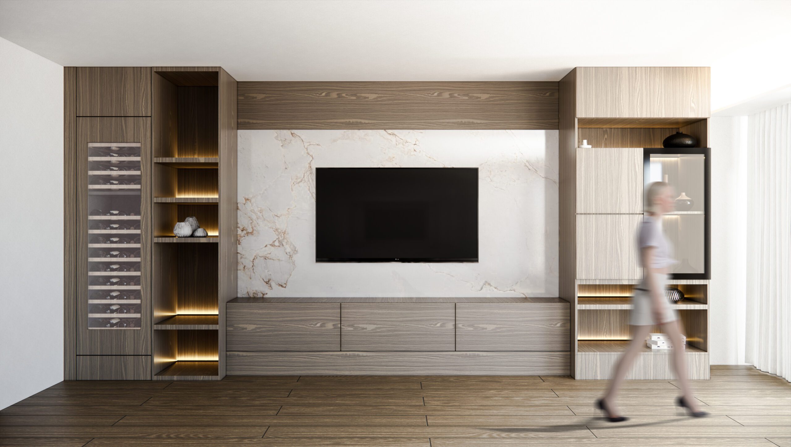 The storage shelf was plain and open which made the space seem cluttered. So, the storage shelf was removed and the TV unit was designed on the adjacent wall with the furnitures organized around it. Contrasting luxury finish materials like marble and texture wood were used to accentuate the TV unit with a touch of black metal accents in between. The sockets were concealed inside the storage to provide a seamless exterior facade.