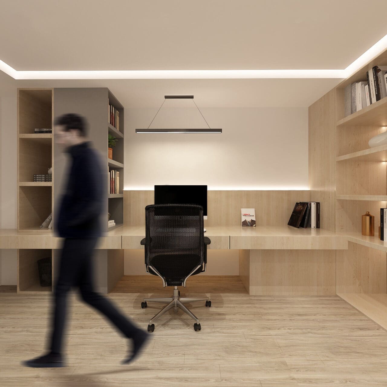 The former home office had a compact and restricting layout. The layout was maximized and the home office was delineated into comfortable zones. There is a generous amount of open space storage and a work station with closed drawers. Black, grey and wooden tones are used with white walls and ceiling as the canvas. The previous interior had an oddly placed storage shelf in a corner which provided an unexciting experience.